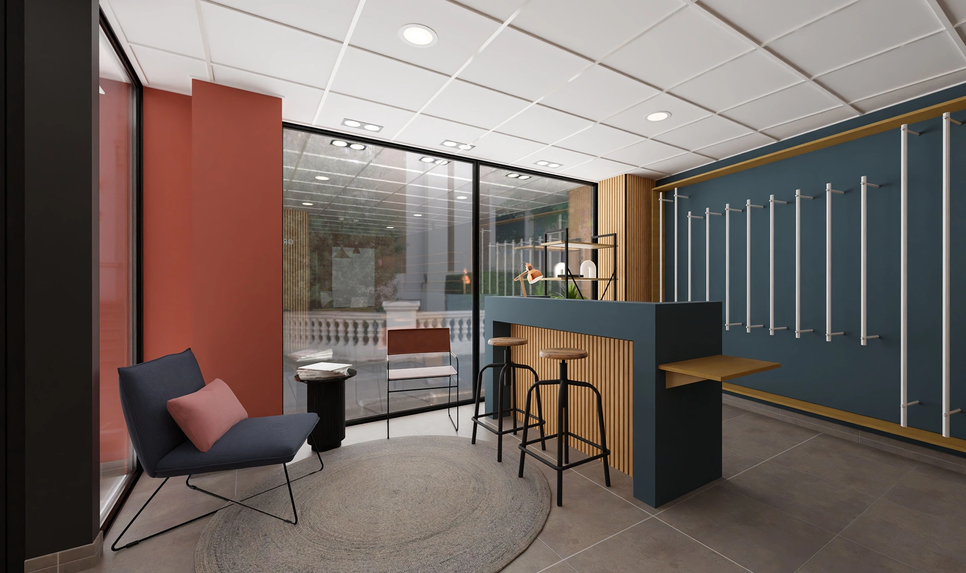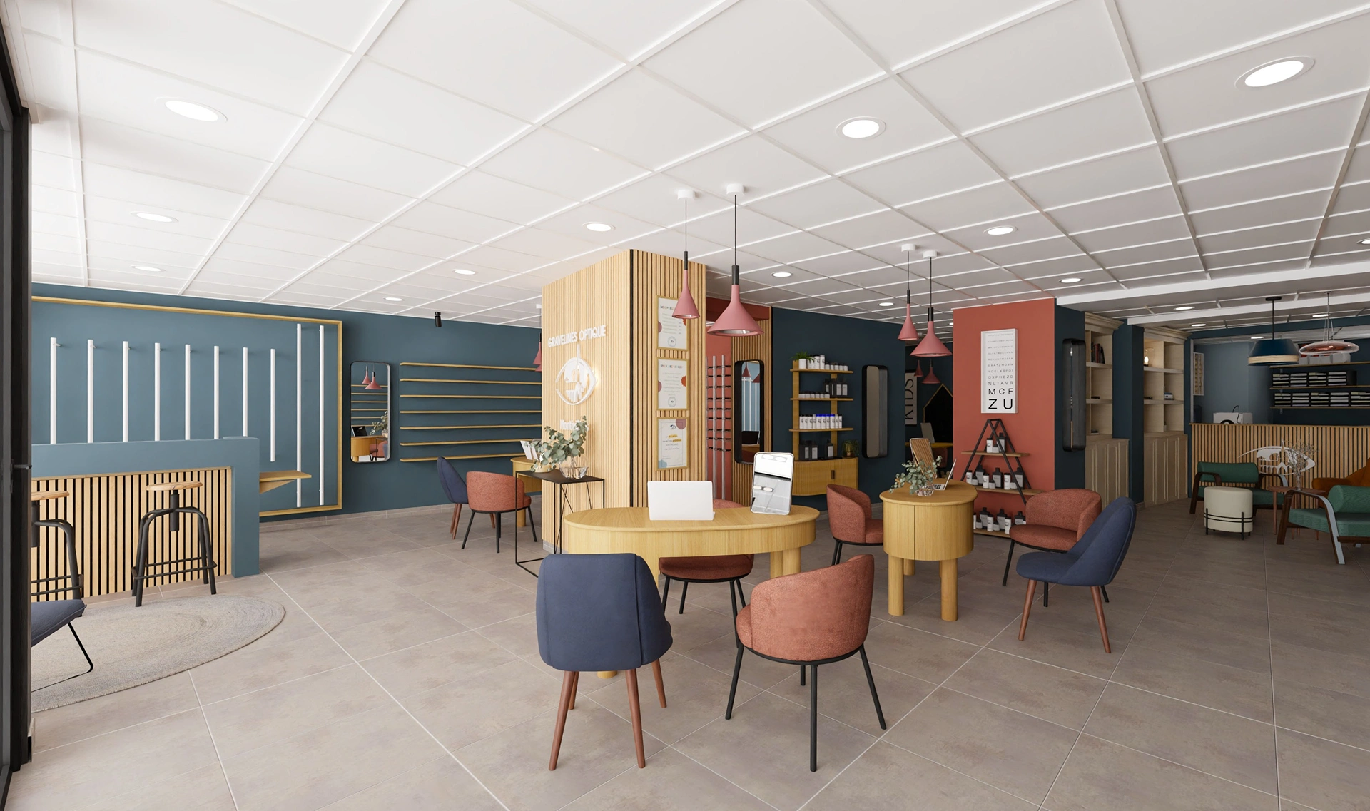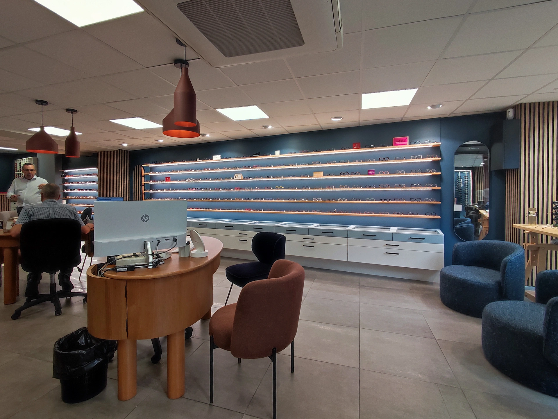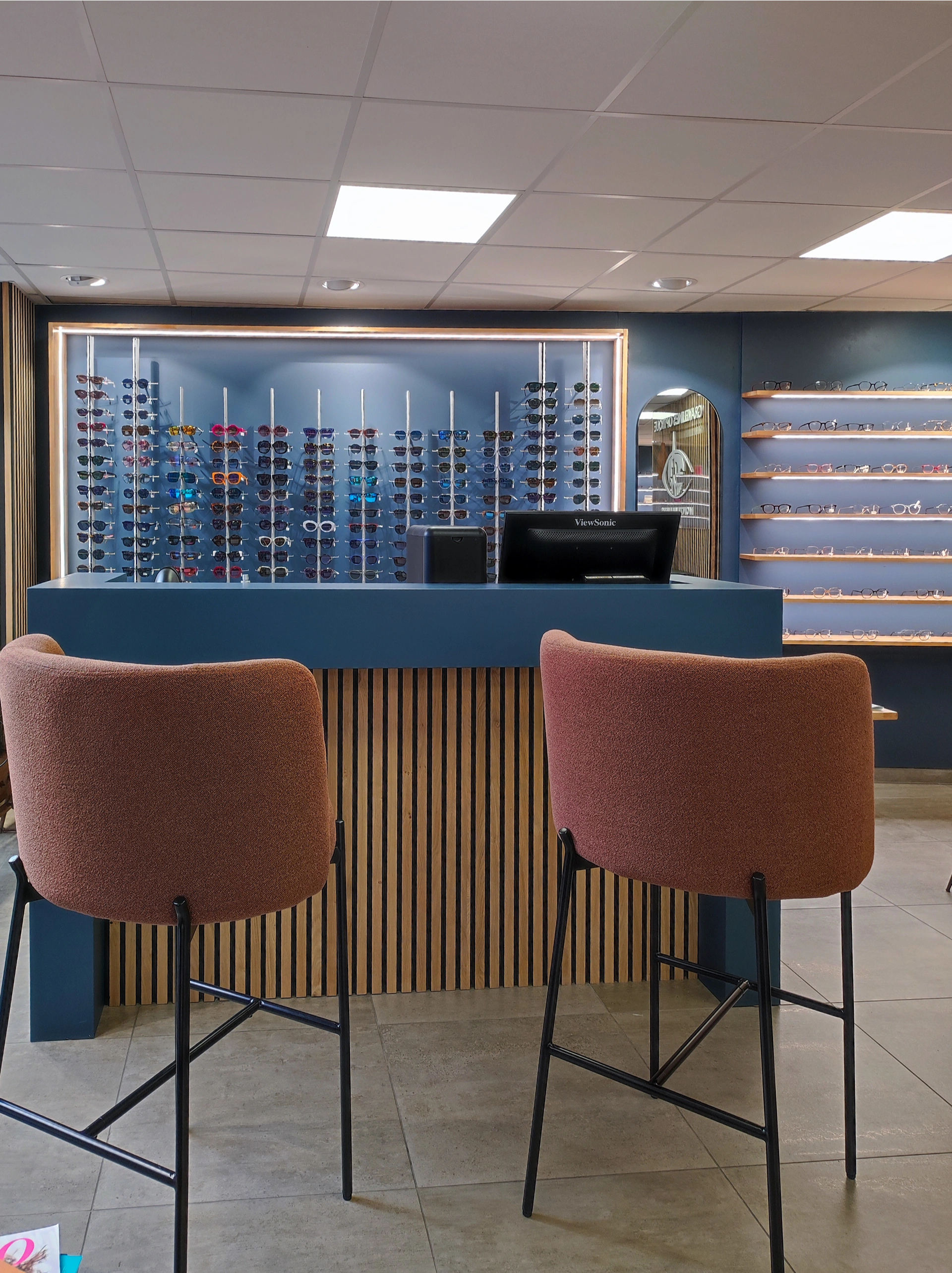 Nous avons conçu un univers contemporain mariant élégance et praticité. Les tons profonds bleu et terracotta dialoguent avec le bois clair pour instaurer une atmosphère moderne et rassurante. Des claustras rythment l’espace et structurent les différentes zones : accueil, présentation des montures, espace de travail et coin attente. Le mobilier arrondi en bois adoucit les lignes et invite à l’échange, tandis que l’éclairage soigné met en valeur chaque détail. Cette rénovation offre une boutique harmonieuse, claire et conviviale, où la décoration soutient pleinement l’expérience client.