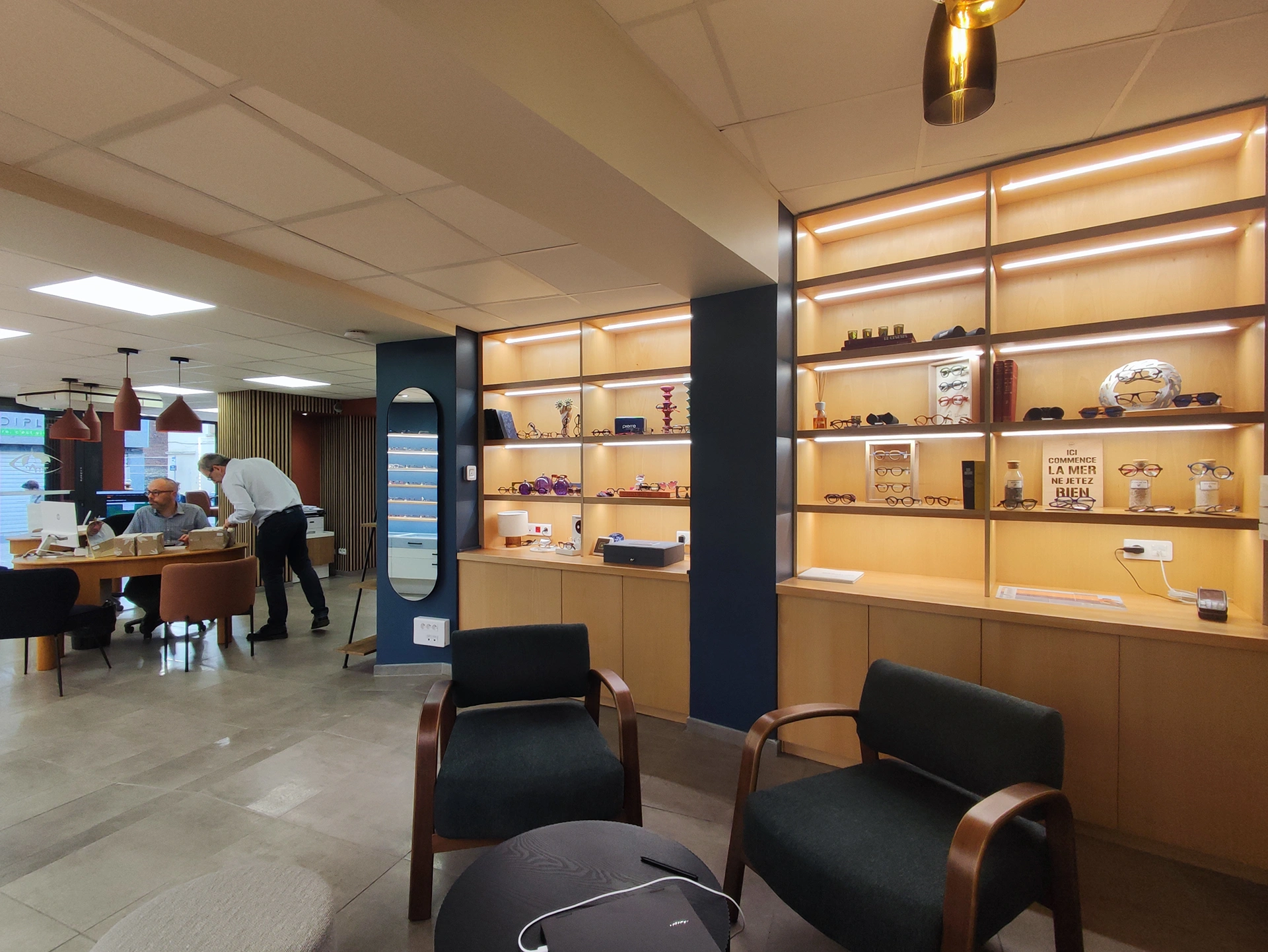 Gravelines Optique souhaitait rénover entièrement son espace de vente afin de moderniser son image et d’offrir une expérience client fluide, chaleureuse et professionnelle. L’objectif était de transformer la boutique en un lieu accueillant, fonctionnel et distinctif, tout en valorisant la présentation des collections et en créant un confort optimal pour les visiteurs comme pour l’équipe.
