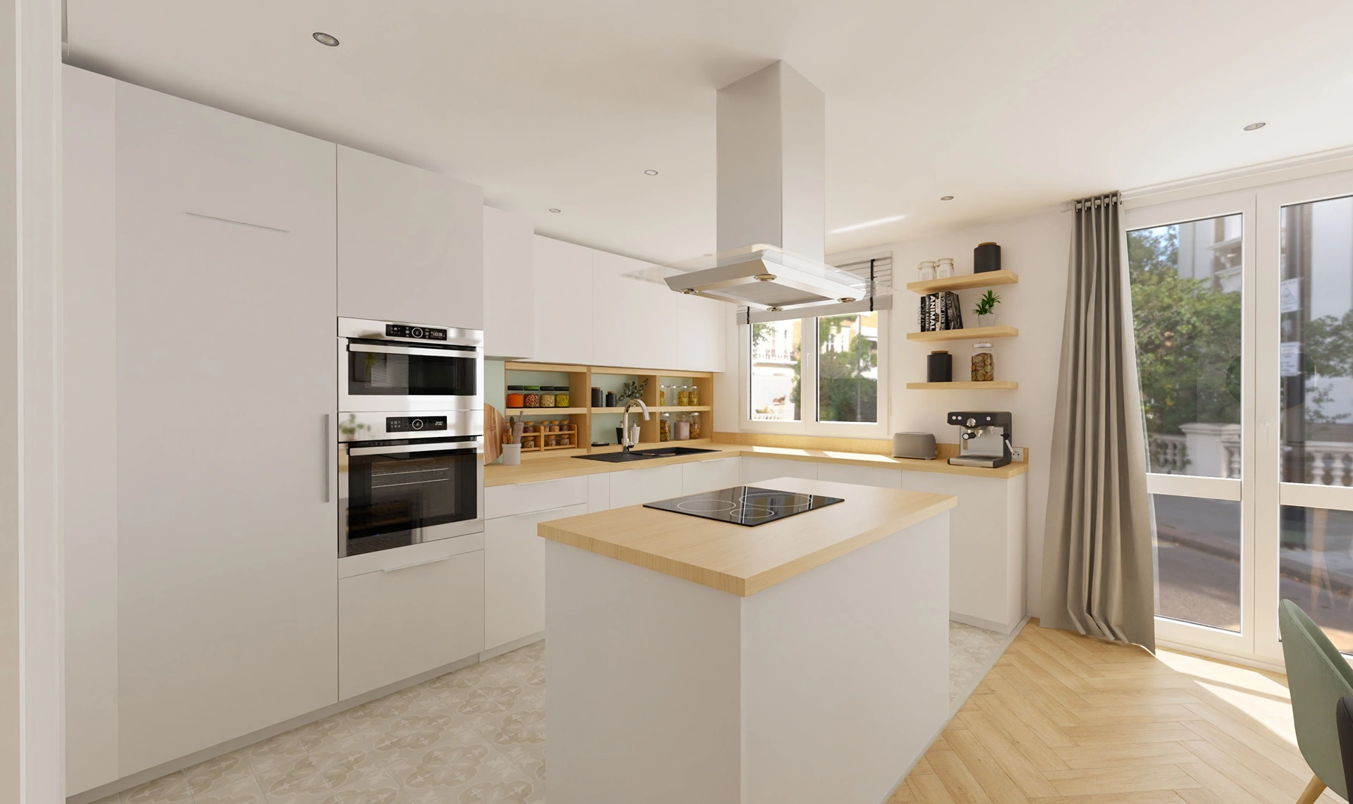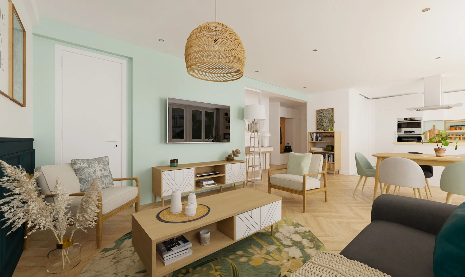Ils désiraient également optimiser les volumes, profiter pleinement de la lumière naturelle et obtenir une harmonie globale dans les couleurs, les matériaux et la décoration. Le style recherché s’inspirait de l’univers scandinave, avec une dominante de vert, et devait intégrer plusieurs meubles et objets de décoration existants afin de créer un ensemble cohérent.