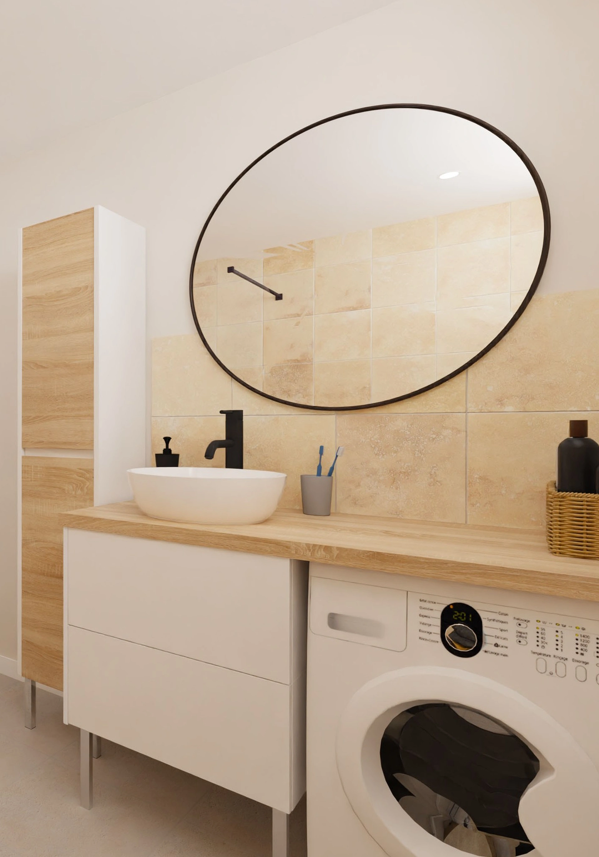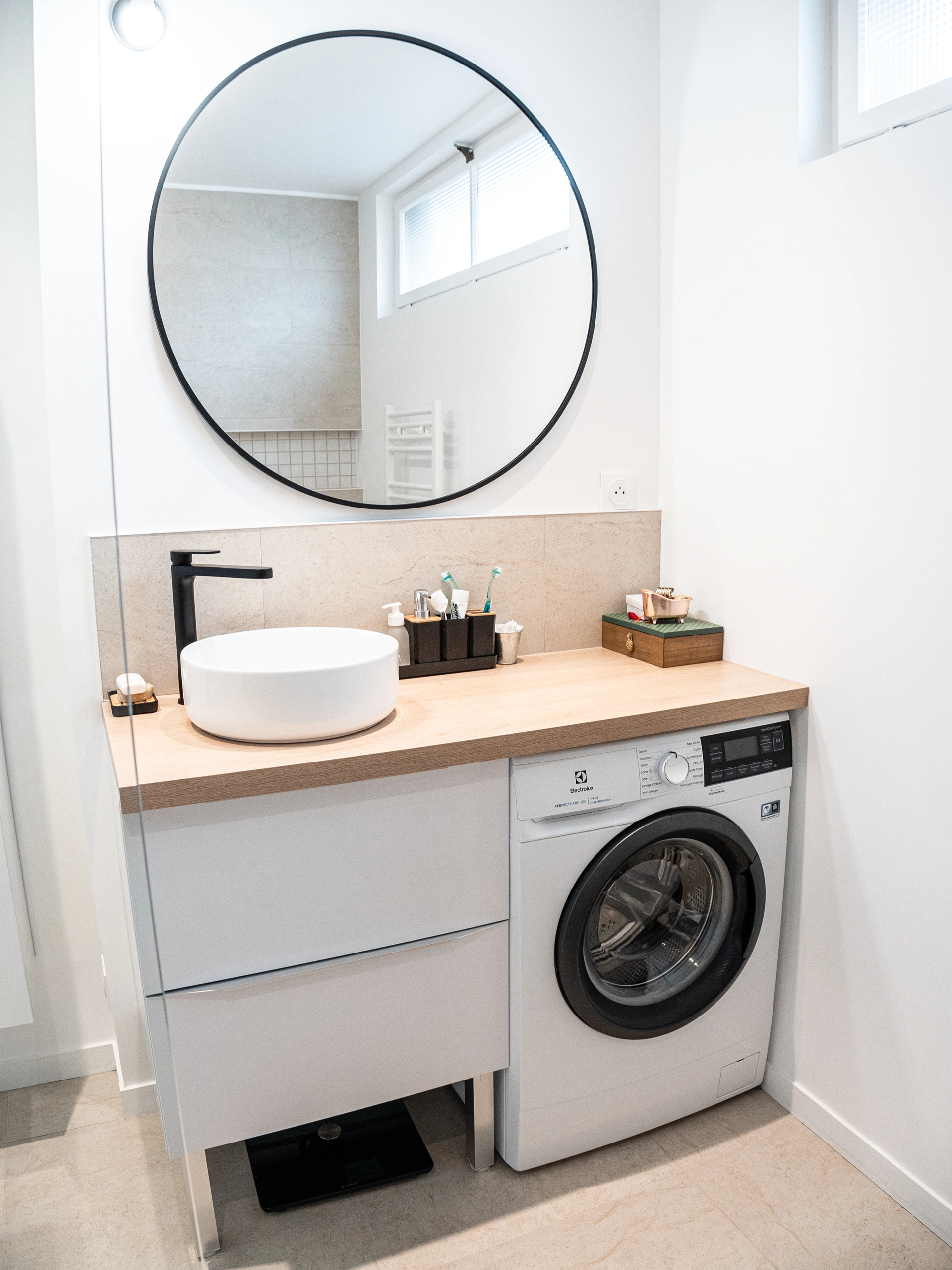 La salle de douche adopte un style naturel avec une faïence beige effet pierre, contrastée par des détails noirs, et intègre des solutions pratiques comme une niche dans la douche et une machine à laver dissimulée. Les WC, enfin, associent carreaux de métro, imitation carreaux de ciment et bleu clair pour un résultat à la fois élégant et graphique.