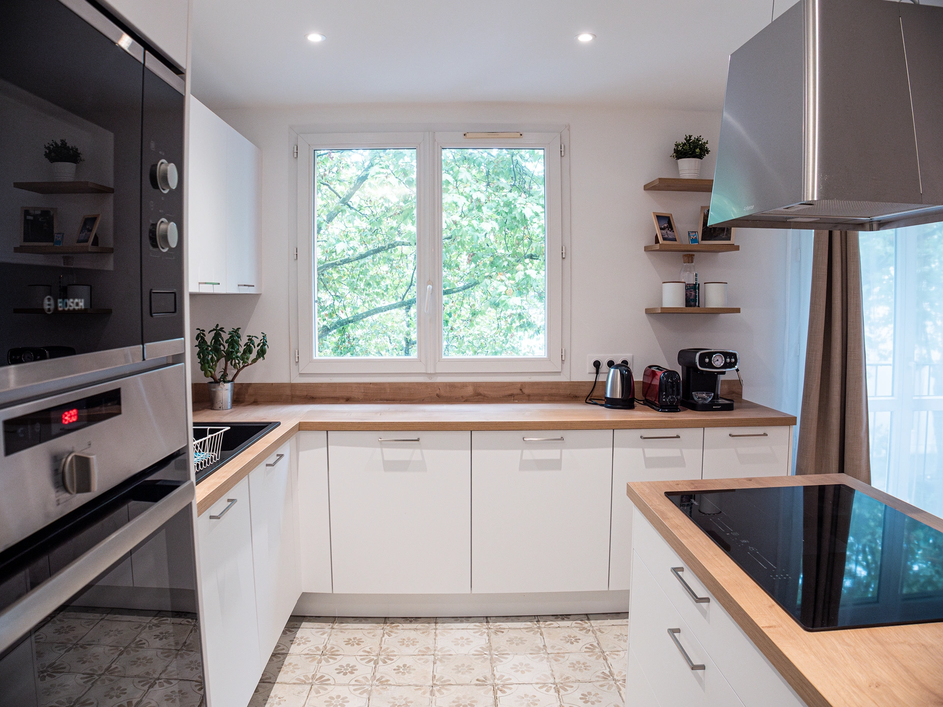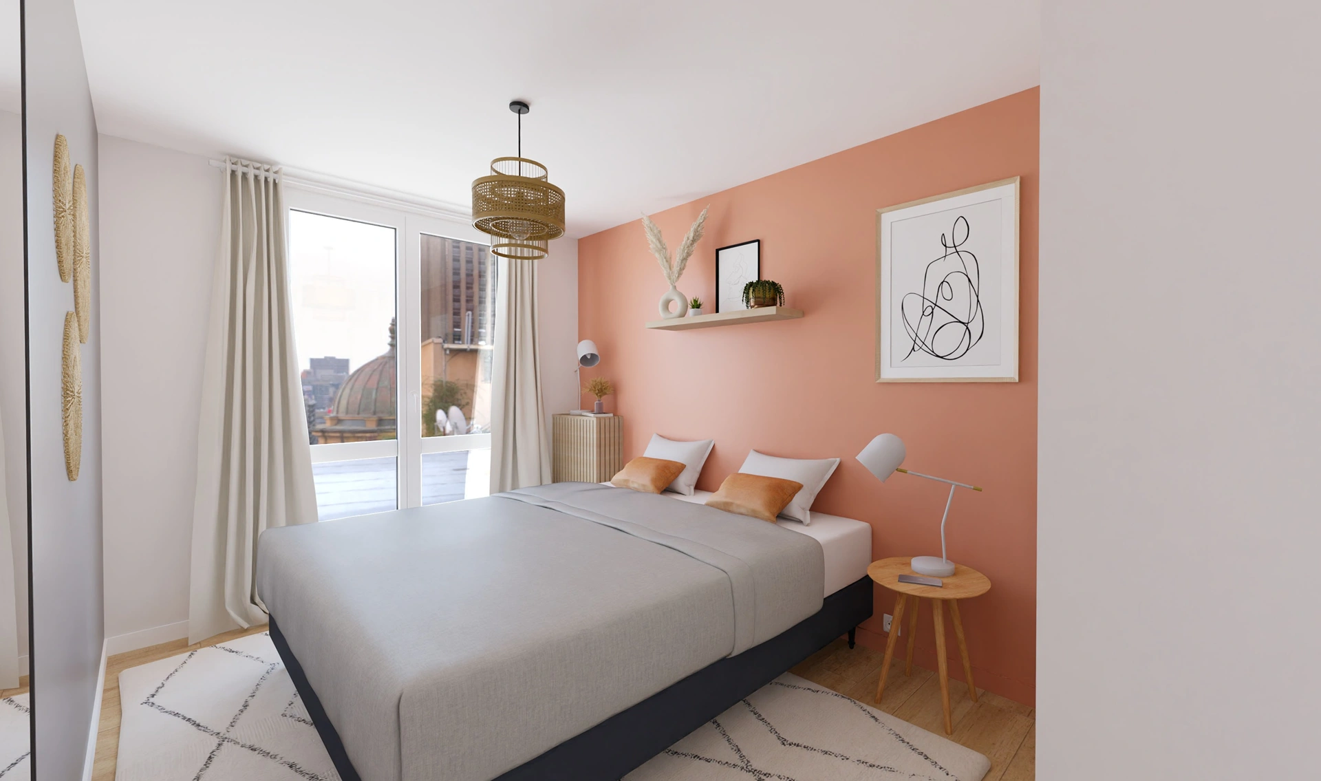 La cuisine, ouverte et conviviale, s’organise autour d’un îlot central et d’un sol effet carreau de ciment discret, mêlant modernité et esprit scandinave. Dans la chambre parentale, un mur terracotta et un dressing optimisent confort et rangement, tandis que la seconde chambre reste volontairement sobre pour accueillir différents usages.
