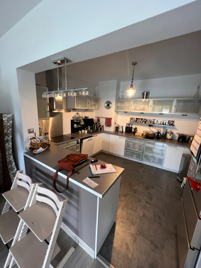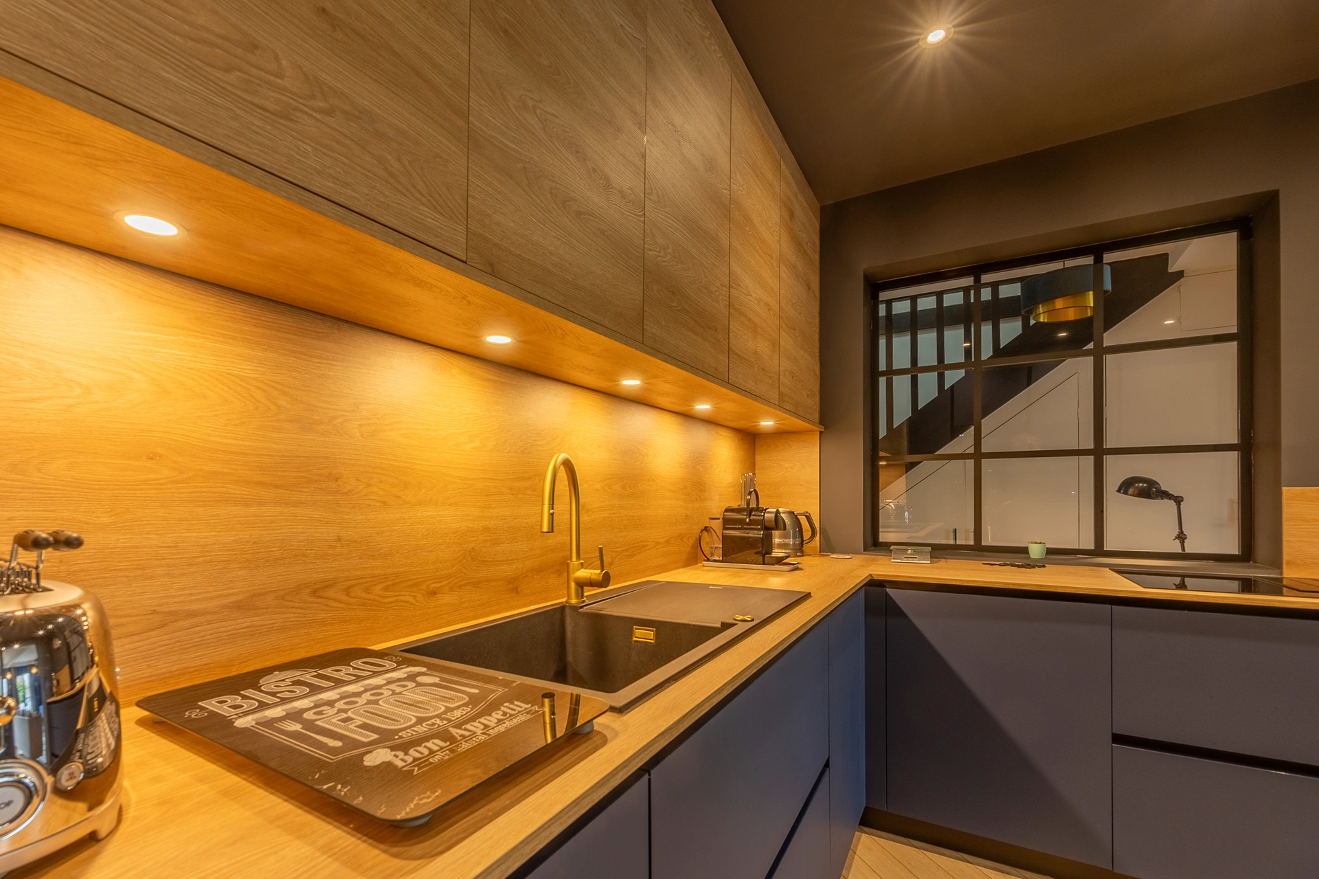 La cuisine sur mesure reprend les codes du séjour, avec un îlot central convivial, des rangements optimisés et une verrière apportant lumière au couloir. L’ambiance noire, rehaussée par des spots à intensité variable, offre un style affirmé et intimiste.