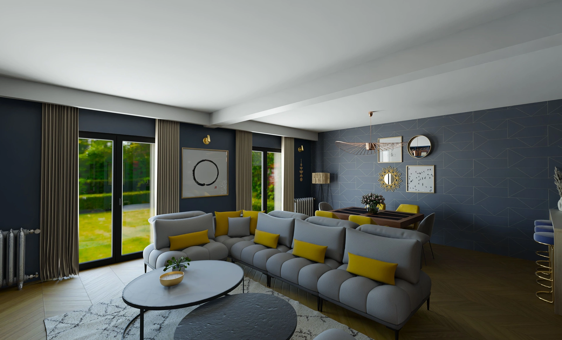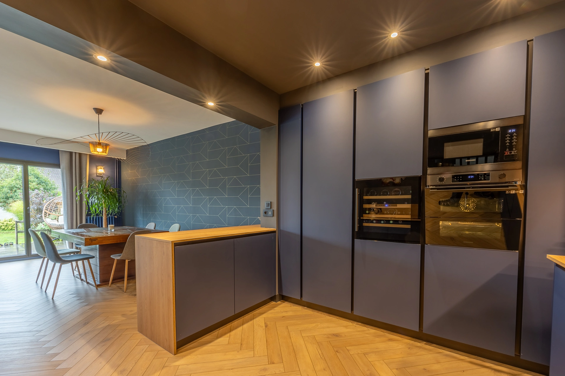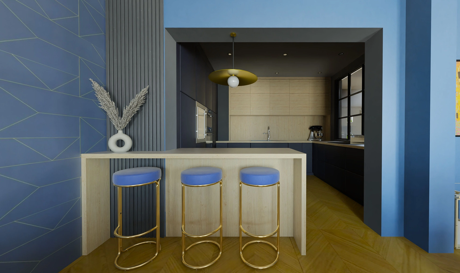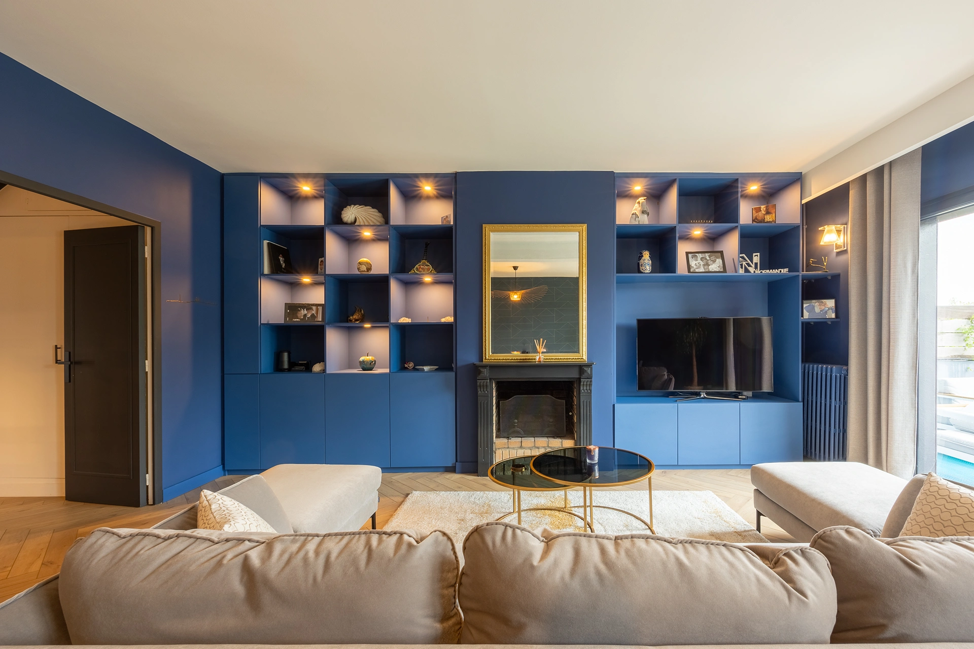 Nos clients souhaitaient repenser entièrement leur séjour et leur cuisine dans un style design, contemporain et personnalisé, avec une dominante de bleu.