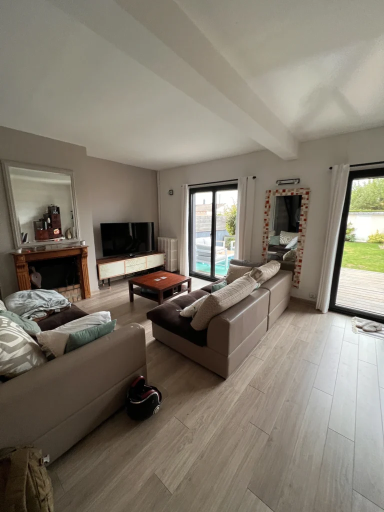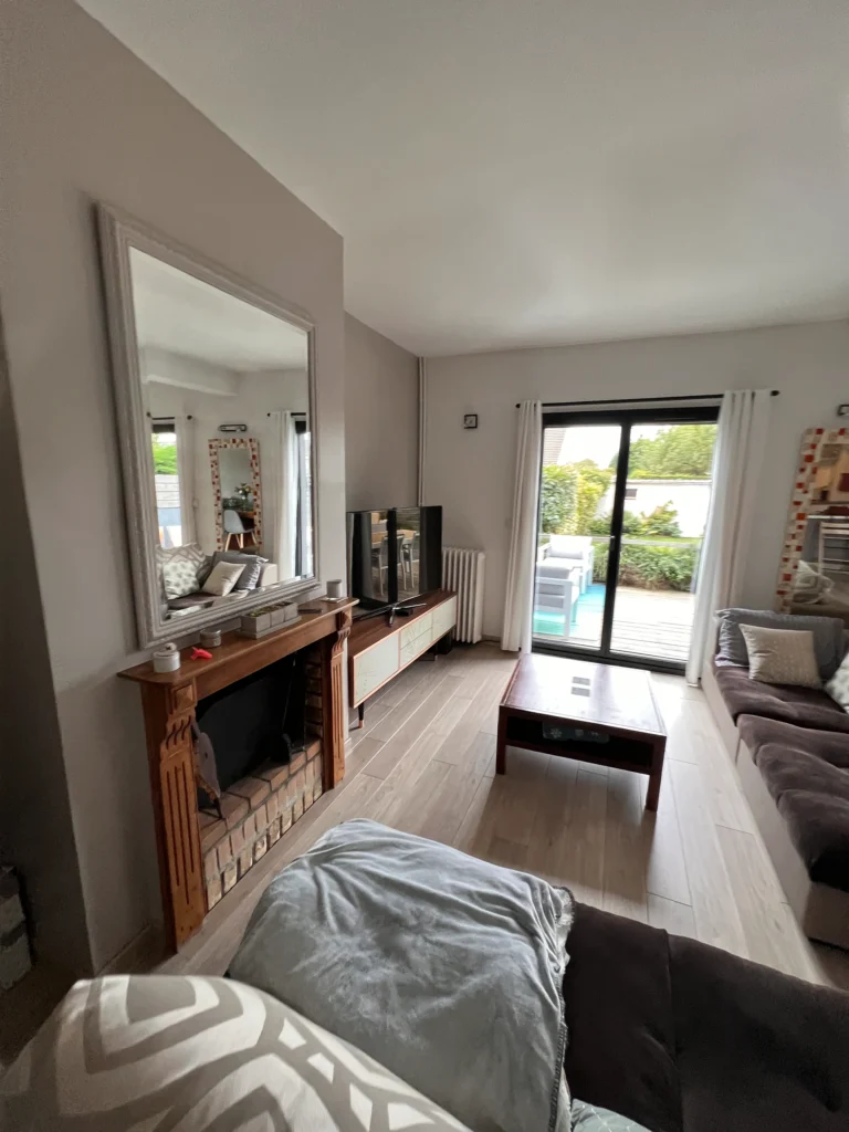 Dans le séjour, une bibliothèque sur mesure et un sol en chevron LVT apportent élégance et caractère. Un camaïeu de bleus habille les murs, le mobilier et les décors, créant une ambiance contemporaine et chaleureuse. Le mobilier a été entièrement renouvelé, des chaises au canapé, avec une sélection de décorations murales et textiles.