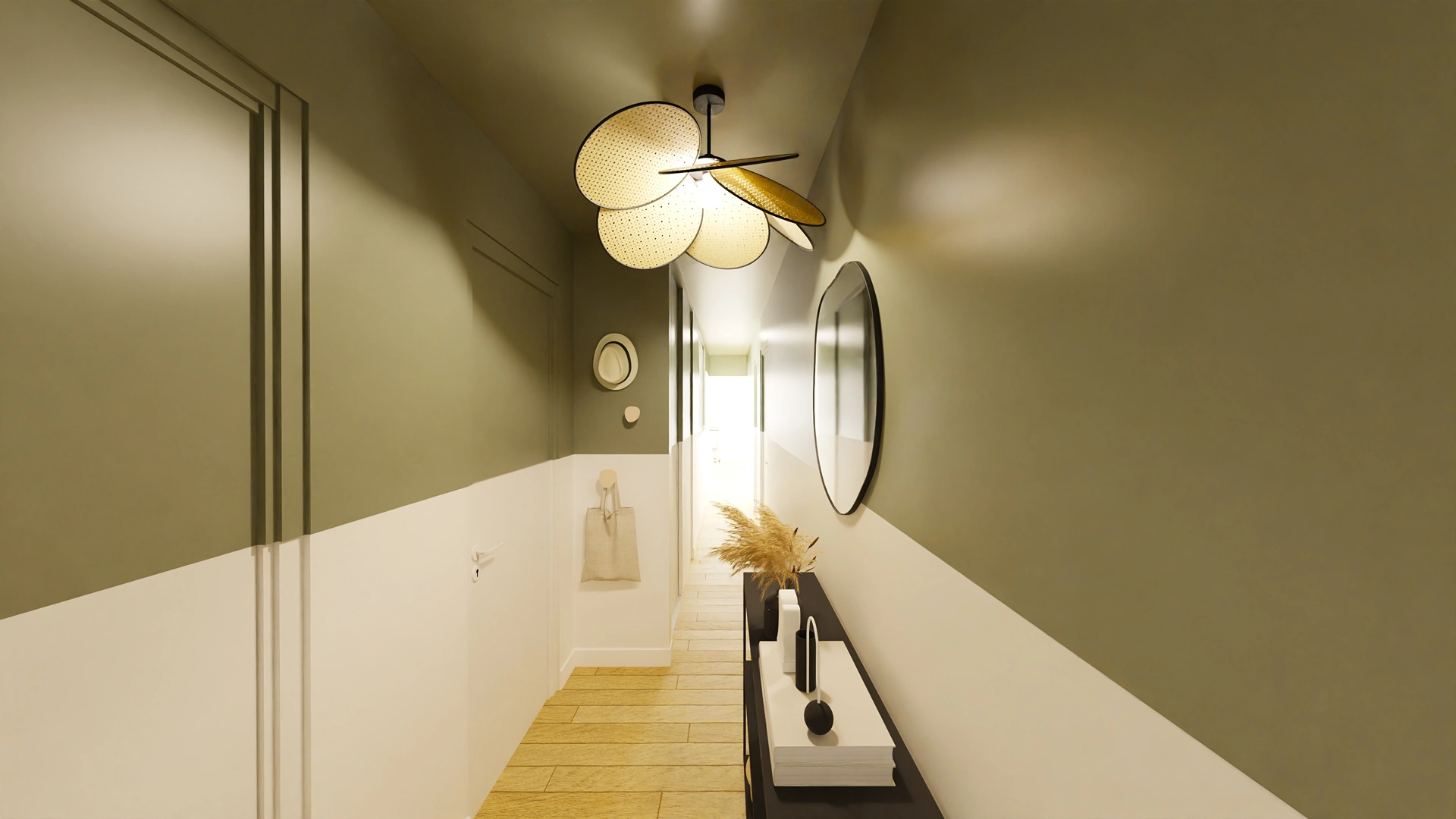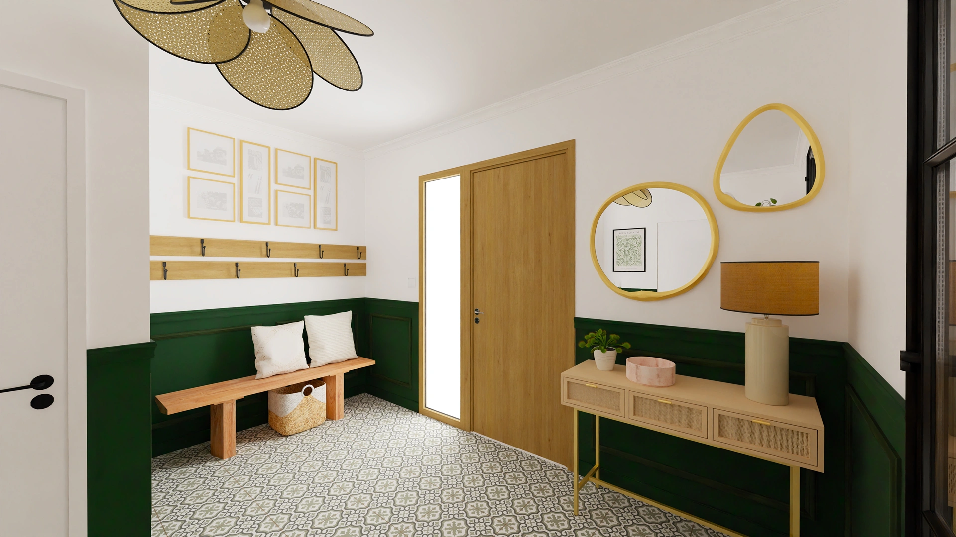 Enfin, les accessoires décoratifs apportent personnalité et chaleur : un tapis qui guide le pas, des cadres, des paniers, un vide-poches, un miroir rond ou graphique, ou encore quelques plantes d’intérieur qui insufflent vie et fraîcheur.