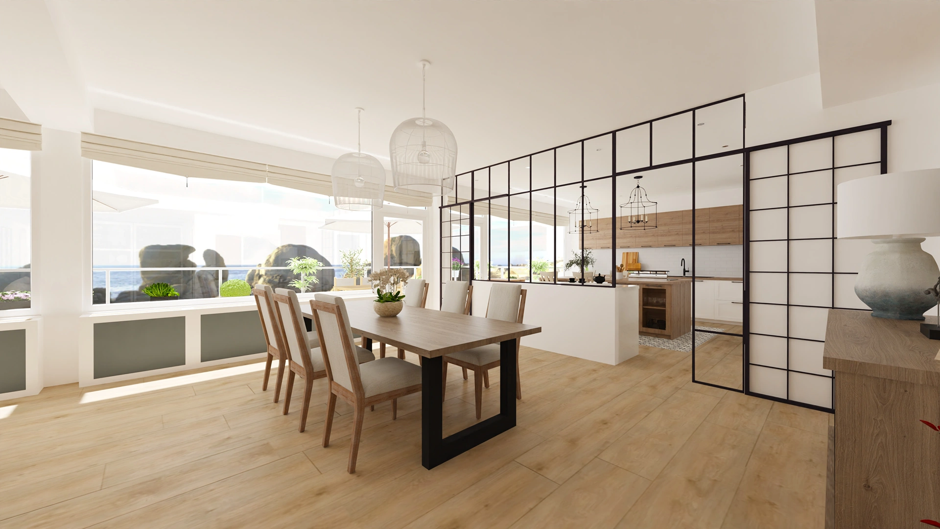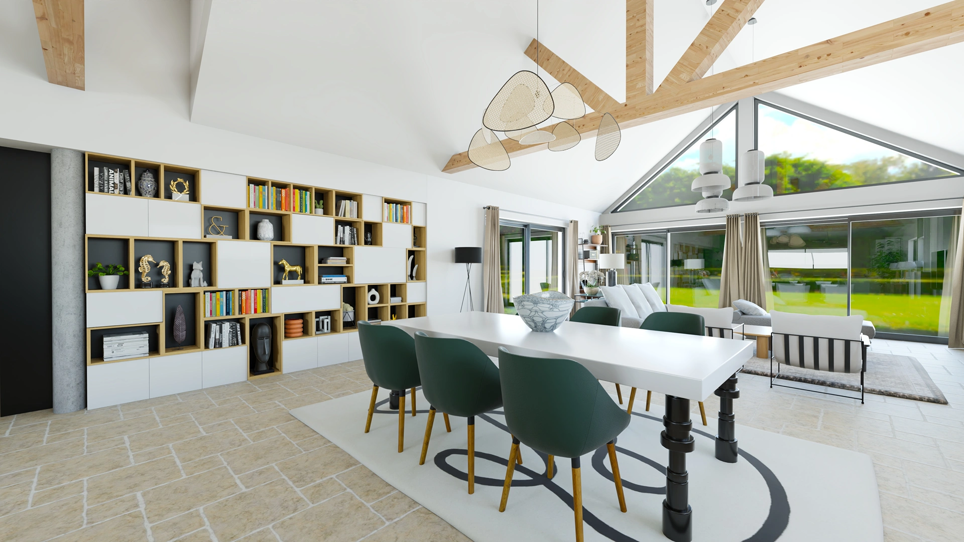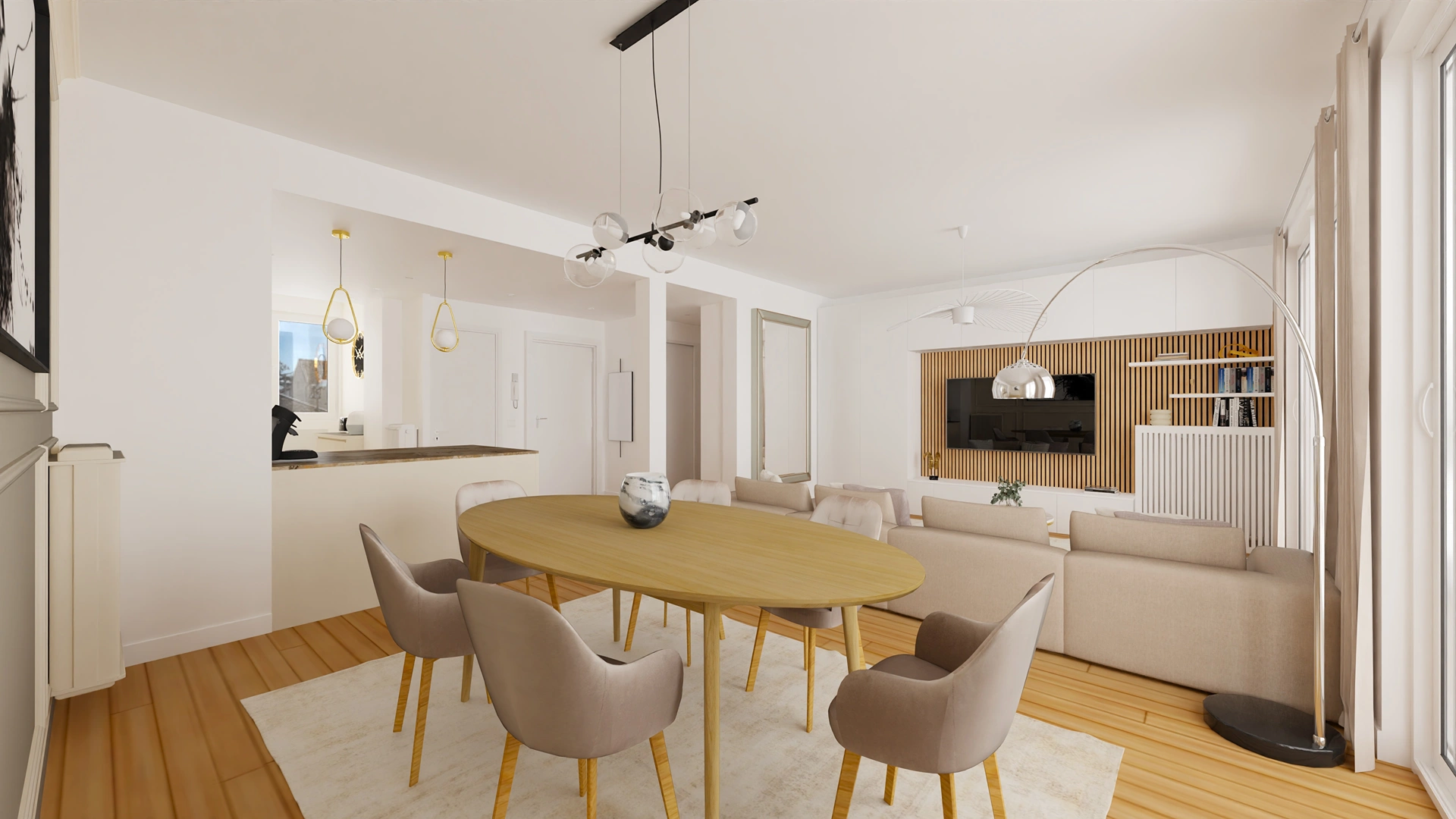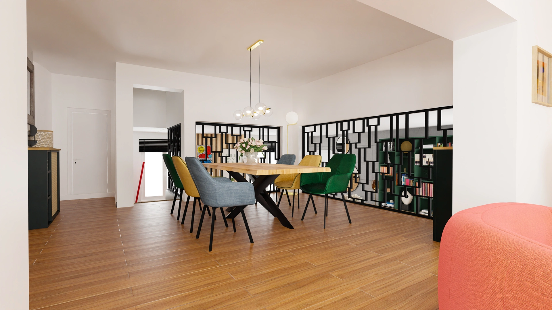 Dans un espace ouvert, la salle à manger peut être délimitée visuellement par un tapis, une suspension ou un changement de sol. Dans une pièce dédiée, l’accent est mis sur l’ambiance globale, la cohérence des volumes et le confort acoustique.
